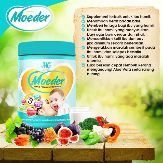Terdapat 15 kandungan yang berkhasiat terdapat di dalam moeder moeder baik untuk kandungan.